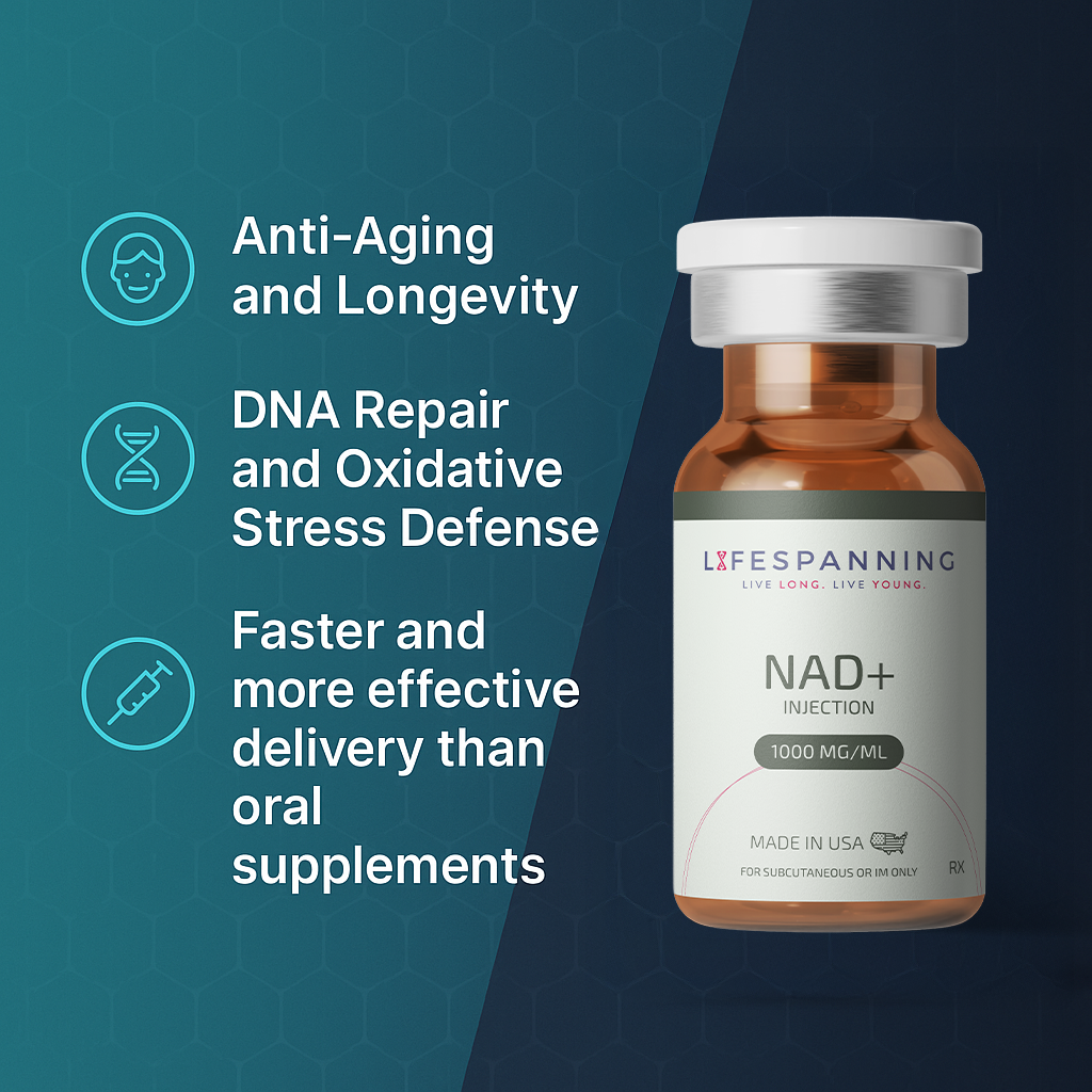 As NAD+ levels decline with age. Injectable NAD+ is positioned as a biohacking tool to potentially slow biological aging by activating sirtuins (proteins associated with DNA repair, inflammation reduction, and longevity).